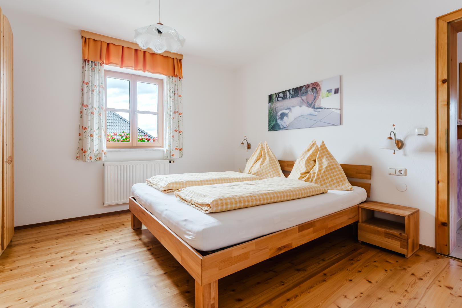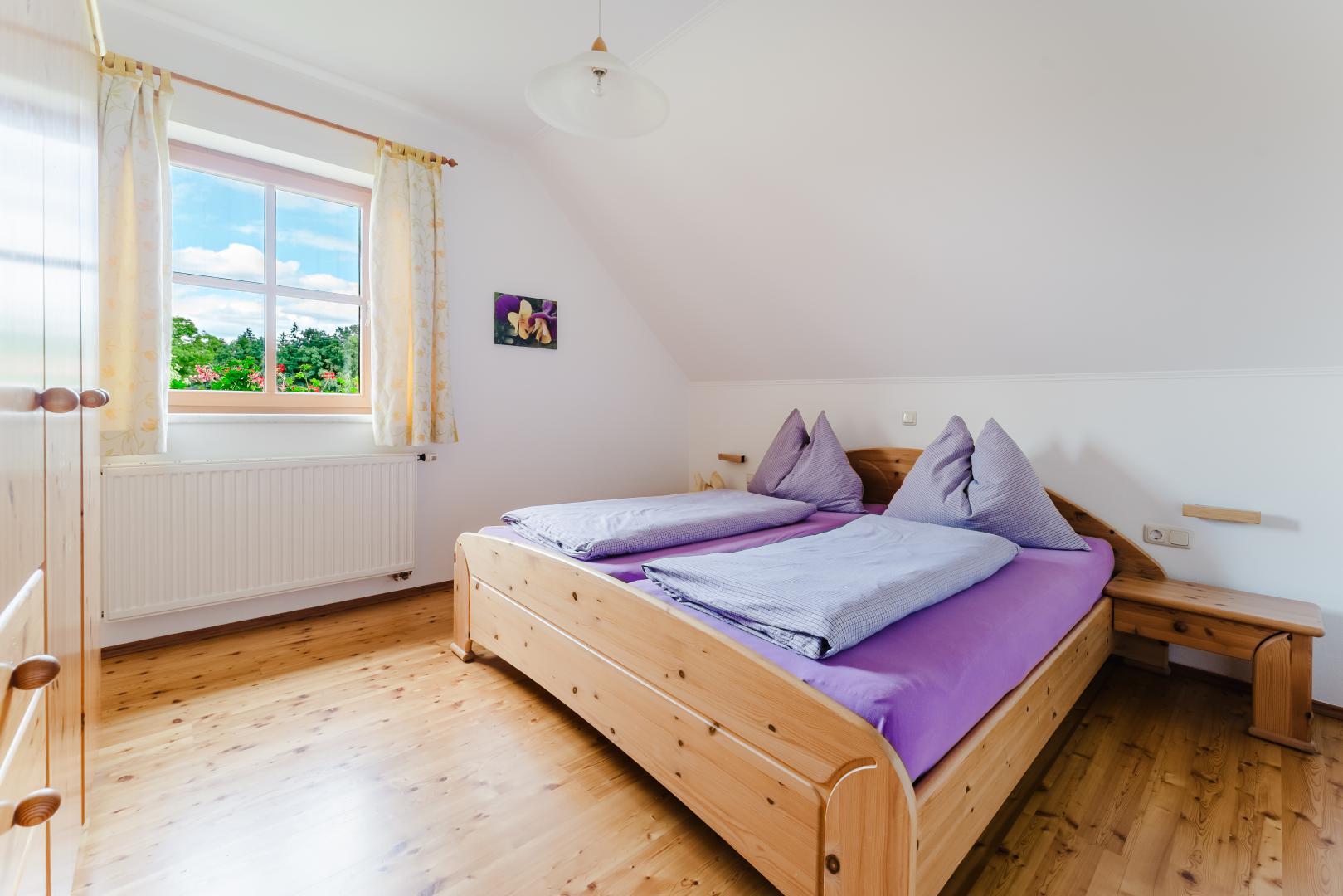 Das freundliche Apartment "Veilchen" ist 65 m² groß und besteht aus 2 Schlafzimmer, Dusche + WC, Wohnraum mit Küche, SAT-TV und Vorraum.